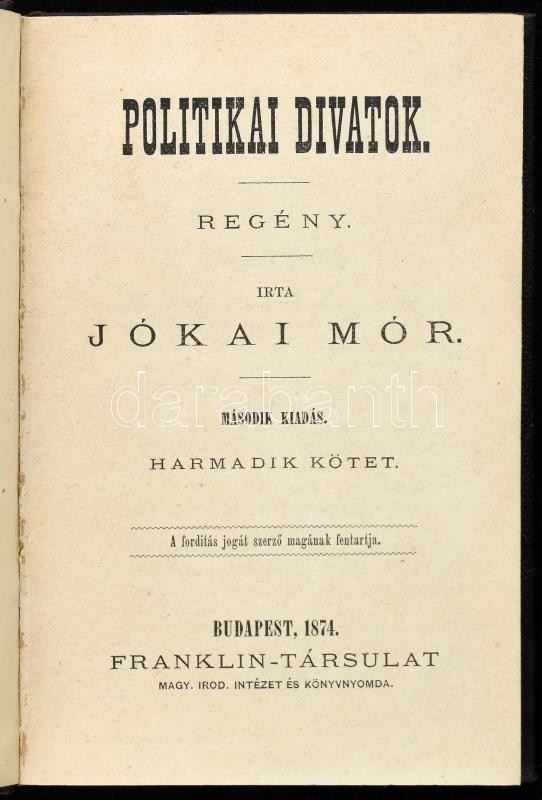 Jókai Mór: Politikai divatok 1-3. kötet. Bp., 1874., Franklin. Korabel... https://www.darabanth.com/hu/426-Gyorsarveres/426.0/Konyvek/Konyvek-Egyeb-ritkasagok~1000024/Jokai-Mor-Politikai-divatok-1-3-kotet-Bp-1874-Franklin-Korabeli-aranyozott-gerincu-felv~II2720382