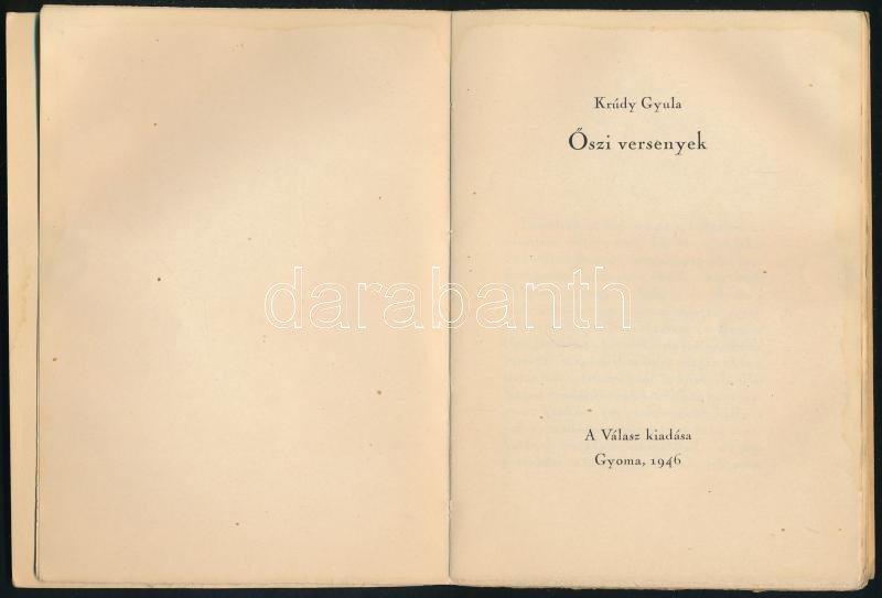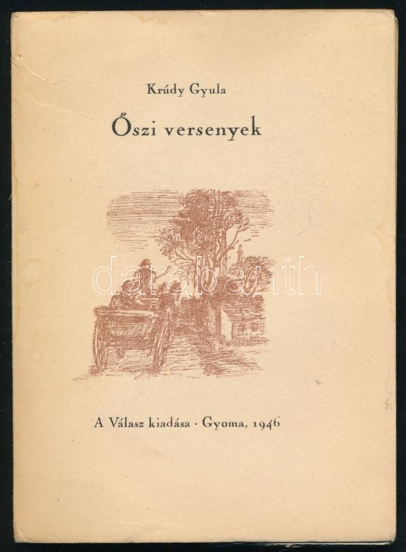 Krúdy Gyula: Őszi versenyek. Gyoma, 1946, Válasz (Kner Izidor-ny.), 111+(1) p. Szabó Vladimir illusztrációival. Kiadói papírkötés, a borítón és a lapok szélén kisebb ázásnyomokkal. Számozott (702.) példány.
