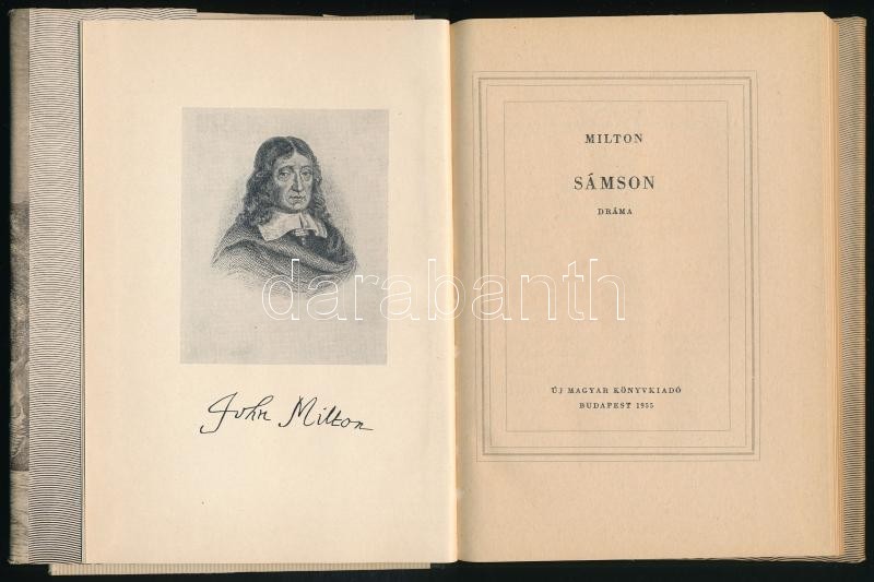 Milton: Sámson. Bp., 1955, Új Magyar Könyvkiadó. Félvászon kötés, szak... https://www.darabanth.com/hu/426-Gyorsarveres/426.0/Konyvek/Konyvek-Egyeb-ritkasagok~1000024/Milton-Samson-Bp-1955-Uj-Magyar-Konyvkiado-Felvaszon-kotes-szakadt-papir-vedobori~II2718669