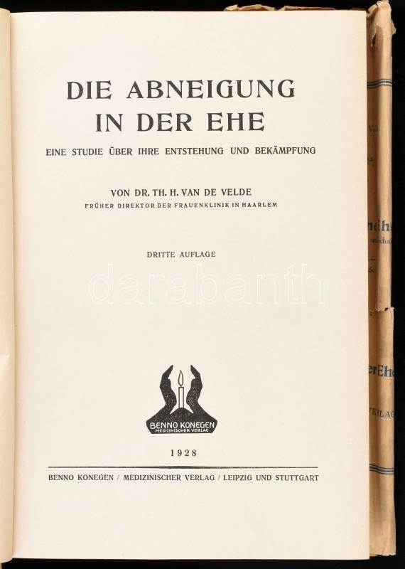 Velde, [Theodoor Hendrik] van de: Die Abneigung in der Ehe. Eine Studie über ihre Entstehung und Bekämpfung. Leipzig-Stuttgart, 1928, Benno Konegen Medizinischer Verlag. Egészoldalas fekete-fehér képekkel illusztrálva. Német nyelven. Kiadói egészvászon-kötés, sérült kiadói papír védőborítóban.