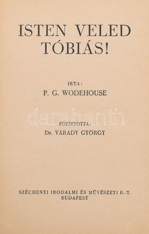 Wodehouse, [Pelham Grenville]: Isten veled Tóbiás! Ford.: Dr. Várady György. Bp., 1944, Széchenyi Irodalmi és Művészeti Rt., 270 p. Egyetlen magyar kiadás. Kiadói aranyozott félvászon-kötés, a gerincen kis sérüléssel, ex libris-szel.
