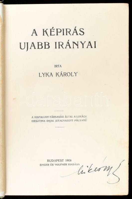 Lyka Károly: A képírás ujabb irányai. Bp., 1906., Singer és Wolfner, 1 t. + 165+3 p.+23 t. Kiadói kopott egészvászon-kötés, kissé sérült gerinccel, egy kijáró táblával. Miklóssy Gábor (1912-1998) erdélyi festőművész névbejegyzéseivel.; Kis krónikák. Szép Könyvek 7. Bp.,én.,Singer és Wolfner. Kiadói sérült papírkötésben, rossz állapotban. Kis könyv a művészetről. Bp., 1964., Képzőművészeti Alap. Fekete-fehér fotókkal illusztrált. Kiadói kemény-kötés, érdekes ajándékozási sorokkal.;