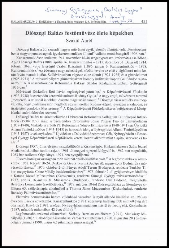 Szakál Aurél: Diószegi Balázs festőművész élete képekben. A szerző, Szakál Aurél (1959-) által Sümegi György (1947-) művészettörténésznek DEDIKÁLT példány. Különlenyomat a Halasi Múzeum 3. évkönyvéből. Kiskunahalas,2009, Thorma János Múzeum, 451-479 p. + Sümegi György: Damkó József: Búsuló kuruc, 1904. Különlenyomat a Halasi Múzeum 2. évkönyvéből. Kiskunahalas,2004, Thorma János Múzeum, 425-430 p.