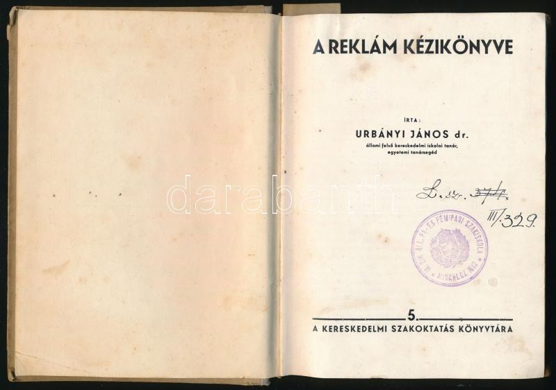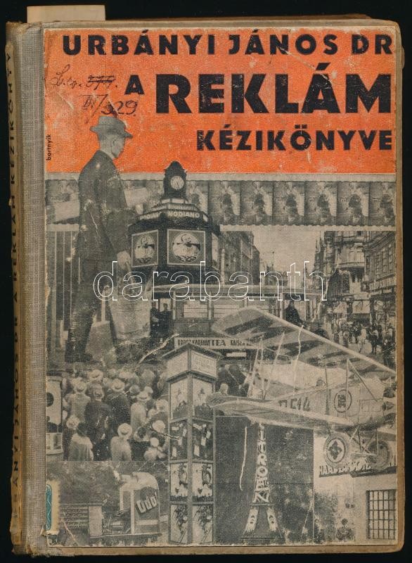 Urbányi János: A reklám kézikönyve. Kereskedelmi Szakoktatás Könyvtára 5. Bp., (1930), Kereskedelmi Szakiskolai Tanárok Országos Egyesülete (Biró Miklós-ny.),184+(8) p. Fekete-fehér képekkel illusztrált. Átkötött egészvászon-kötésben, átkötéskor az eredeti papírborító egy részét felhasználták, kissé sérült, kopott borítóval, néhány kissé foltos lappal, régi intézményi bélyegzővel.
