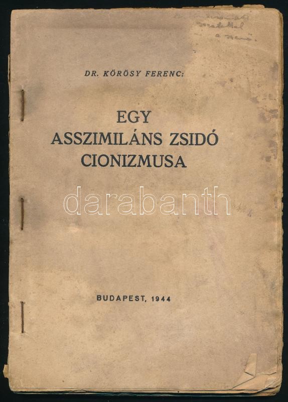 Kőrösy Ferenc: Egy asszimiláns zsidó cionizmusa. A szerző, Szántói Kőrösy Ferenc/ (Francis de Korosy (1906-1997) által DEDIKÁLT példány. Bp., 1944,(Springer Gusztáv-ny.), 95 p. Tűzött papírkötés, foltos, megviselt állapotban.