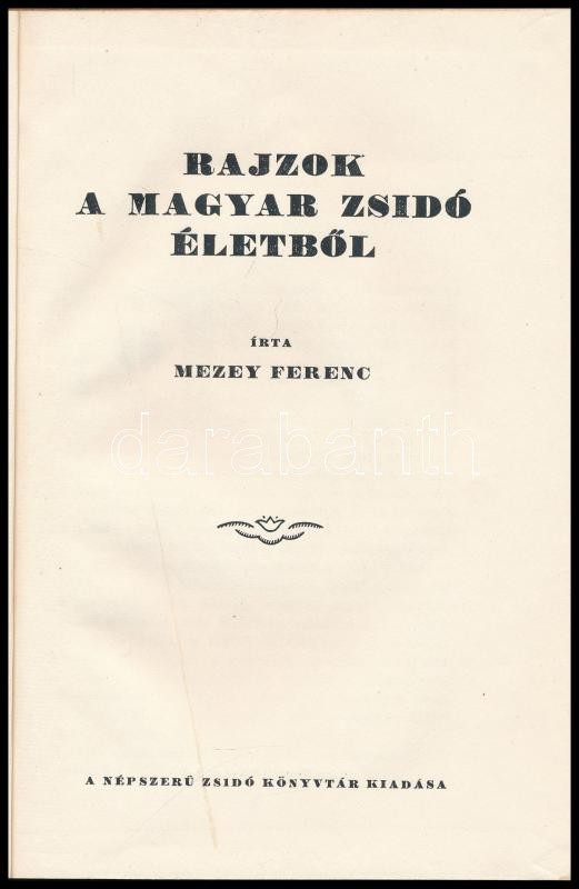 Mezey Ferenc: Rajzok a magyar zsidó életből. Népszerű Zsidó Könyvtár 15. Szerk.: Bánóczi József és Gábor Ignác. [Bp.,1925,] Népszerű Zsidó Könyvtár,[Globus-ny.], 45+3 p. Kiadói kartonált papírkötésben, kissé foltos borítóval.