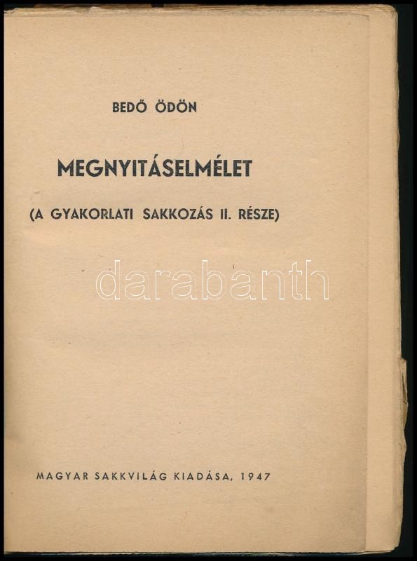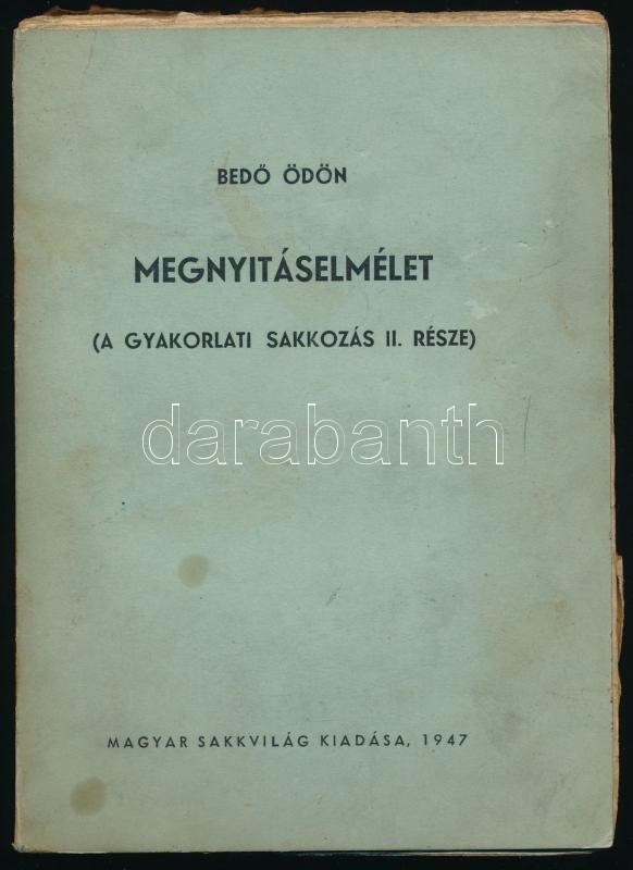 Bedő Ödön: Megnyitáselmélet. (A gyakorlati sakkozás II. része). H.n., 1947, Magyar Sakkvilág, 252+(1) p. Kiadói papírkötés, kissé sérült, koszos borítóval, kissé laza fűzéssel, sérült lapszélekkel.