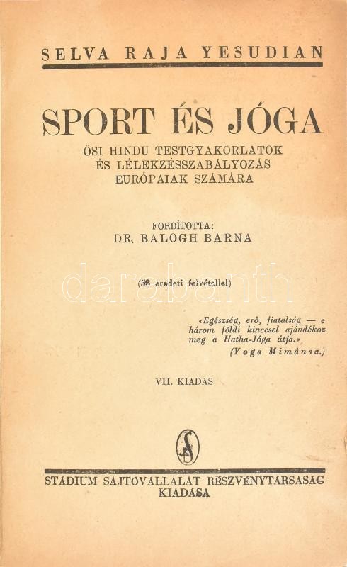 Selva Raja Yesudian: Sport és jóga. Ősi hindu testgyakorlatok és lélekzésszabályozás európaiak számára. Ford.: Dr. Balogh Barna. Bp., é.n., Stádium, 179 p. Hetedik kiadás. Oldalszámozáson kívüli, fekete-fehér képtáblákkal. Átkötött egészvászon-kötésben, néhány kissé sérült, foltos lappal.