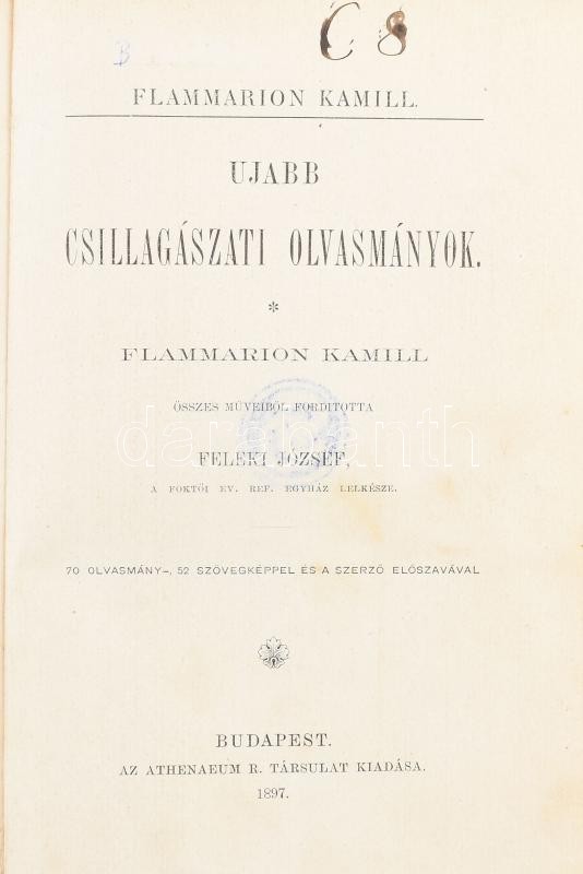 Leírás: Flammarion Kamill: Újabb csillagászati olvasmányok. Bp., 1897, Athenaeum. Szövegközti illusztrációkkal, Átkötött kopott félvászon kötés, ceruzás bejelölésekkel.