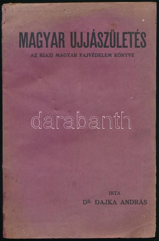 Dr. Dajka András: Magyar újjászületés. Az igazi fajvédelem könyve. Bp.... https://www.darabanth.com/hu/426-Gyorsarveres/426.0/Konyvek/Konyvek-Tortenelem~1000009/Dr-Dajka-Andras-Magyar-ujjaszuletes-Az-igazi-fajvedelem-konyve-Bp-1923-Viktoria-Ko-~II2718619