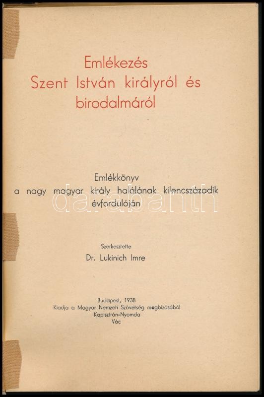 Emlékezés Szent István királyról és birodalmáról. Emlékkönyv a nagy magyar király halálának kilencszázadik évfordulóján. Szerk.: Lukinich Imre. Bp., 1938, Magyar Nemzeti Szövetség (Vác, Kapisztrán-ny.), 222+(2) p. A borító Nagyistók István és Mihály Gyula munkája. Fekete-fehér szövegközi fotókkal, rajta Wekerle Sándor, Tisza Kálmán, Tisza István, Apponyi Albert, IV. Károly, Zita királyné és mások fotóival, valamint Trianon térképpel. Benne: Magyarország története a kiegyezéstől a Trianoni békéig (1867-1920). Kiadói illusztrált papírkötés, sérült, ragasztott gerinccel, a gerincen kisebb tintafolttal.