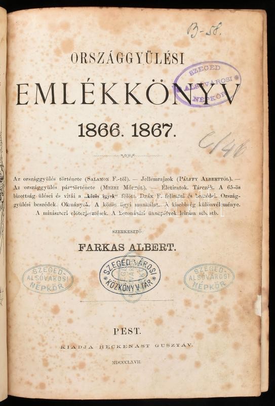 Farkas Albert (szerk.): Országgyűlési emlékkönyv 1866, 1867. Pest, 184... https://www.darabanth.com/hu/426-Gyorsarveres/426.0/Konyvek/Konyvek-Tortenelem~1000009/Farkas-Albert-szerk-Orszaggyulesi-emlekkonyv-1866-1867-Pest-1847-Heckenast-Felvaszon~II2723921