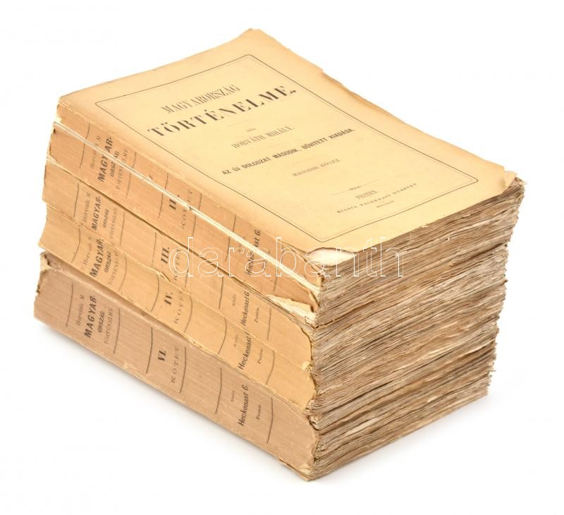 Horváth Mihály: Magyarország történelme. II-IV., VI. köt. (4 kötet.) Pest, 1871-1872., Heckenast Gusztáv. Második kiadás. Kiadói papírkötésekben, egy borítón kis hiánnyal, egy másikon szakadással és kis lyukkal, az egyik könyvtest szétvált, foltos lapokkal.