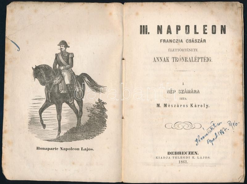 M. Mészáros Károly: III. Napóleon francia császár élettörténete annak trónraléptéig. Debrecen, 1861, Telegdi K. Lajos. Kiadói papírkötés, gerinc szakadt, kopottas állapotban.