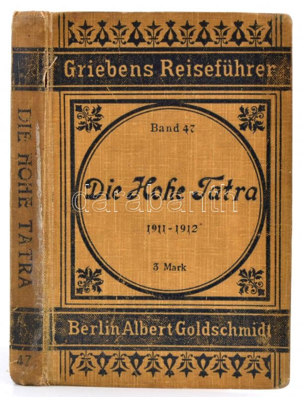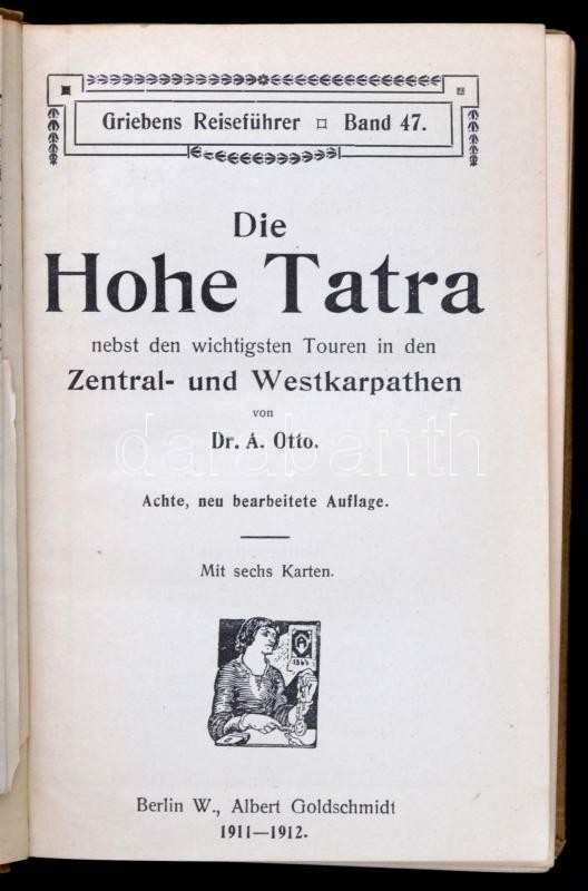Dr. A. Otto: Die Hohe Tatra nebst den wichtigsten Touren in der Niederen Tatra, den Zentral- und Westkaprathen. Griebens Reisehürer 47. Berlin, 1912, Albert Goldschmidt, VI+282+6+16 p. 8. kiadás. Kiadói egészvászon-kötés, térkép-melléklettekkel korabeli reklámokkal,német nyelven./ Linen-binding, with maps, in German language