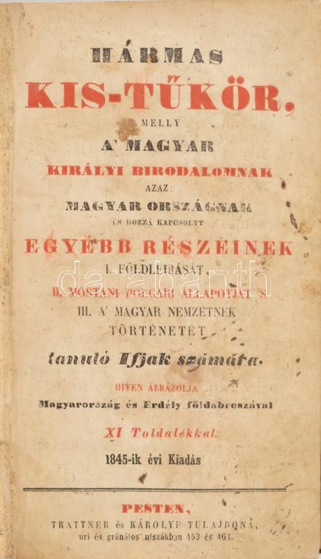 [Losontzi István]: Hármas Kis-Tükör, melly Magyar Királyi Birodalomnak az az Magyar Orszángak és hozzá kapcsoltt egyébb részeinek. I. földleirását, II. mostani polgári állapotját, 's III. a magyar nemzetnek történetét tanuló ifjak számára hiven ábrázolja. Magyarország és Erdély földabroszával. XI. toldalékkal. 1845-ik évi kiadás. Pest, 1845, Trattner-Károlyi, 330+96+XVI p. Átkötött félvászon-kötés, márványozott lapélekkel, kopott borítóval, foltos lapokkal, bejegyzésekkel, térkép nélkül (!)