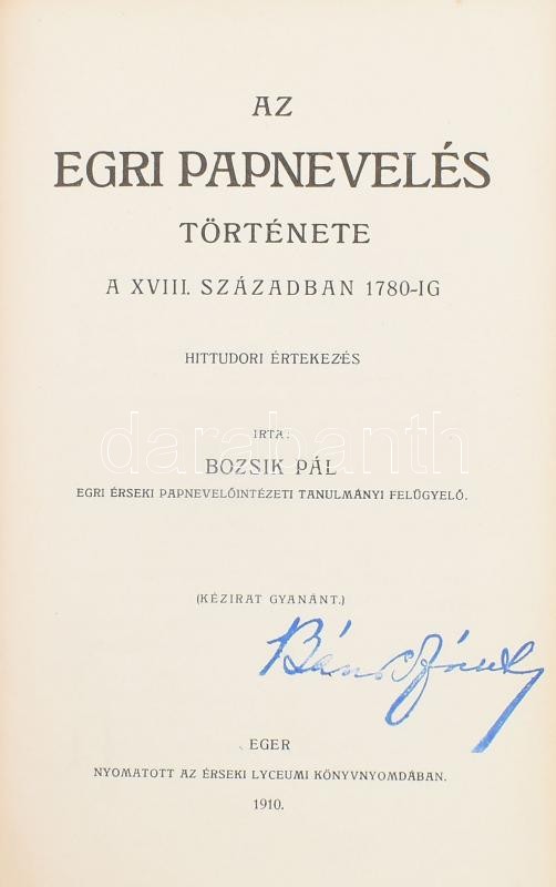 Bozsik Pál: Az egri papnevelés története a XVIII. században 1780-ig. Hittudori értekezés. (Kézirat gyanánt). Eger, 1910, Érseki Lyceumi Könyvnyomda, 217 p. Kiadói aranyozott, dombornyomott egészvászon-kötés (Neszvadba Gy. könyvkötő, Eger), festett lapélekkel, tulajdonosi névbélyegzővel, szép állapotban.