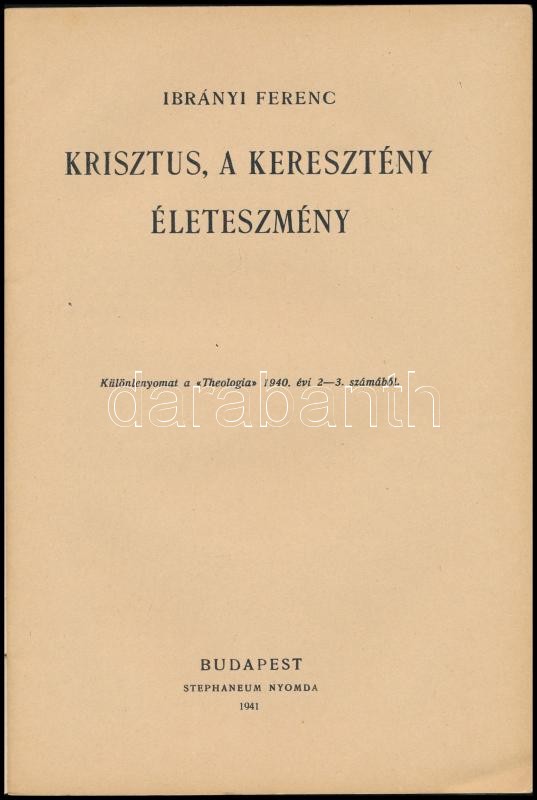 Ibrányi Ferenc: Krisztus, a keresztény életeszmény. Különlenyomat a "Theologia" 1940. évi 2-3. számából. Bp., 1941, szerzÅ‘i magánkiadás (Stephaneum-ny.), 31+(1) p. Kiadói tűzött papÃrkötés.