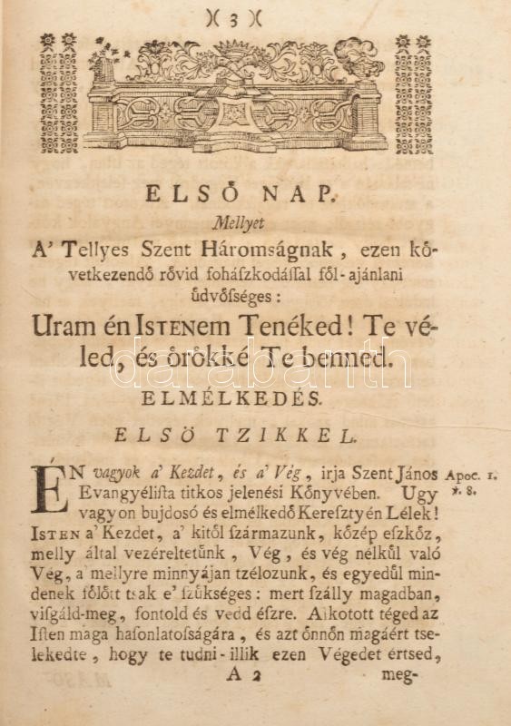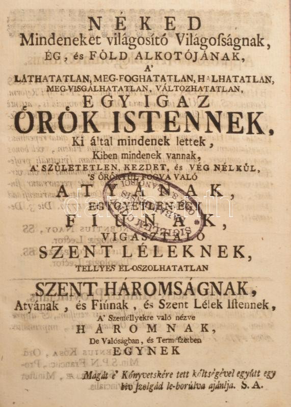 Leírás: Lelki-isméretnek ösztöne, az az: egy titkos értelmű tövisses kert... Győr, 1770, Streibig. Kartonált kötés, kopottas állapotban.