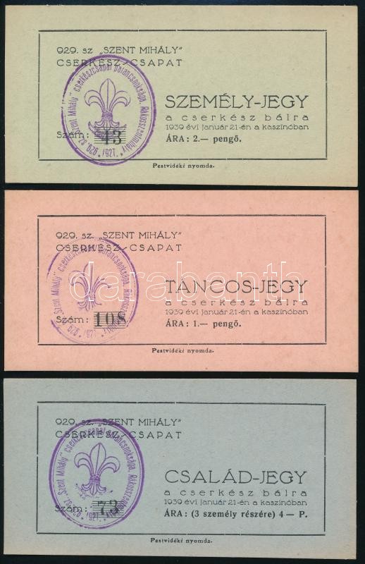 Leírás: 1939 3 db cserkész bálra szóló számozott jegy, 929. sz. "Szent Mihály" cserkészcsapat parancsnoksága, Rákosszentmihály bélyegzőjével,