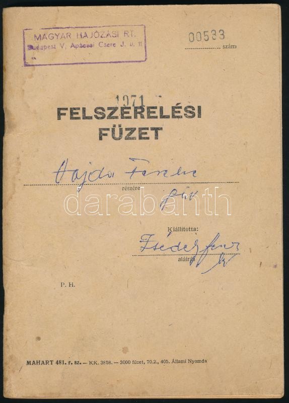 Leírás: 1971 Magyar Hajózási Rt. (MAHART) Felszerelési füzet, Bp., Állami Ny., 96 p., 3000 pld., nemzeti színű zsinórral fűzve, bejegyzésekkel