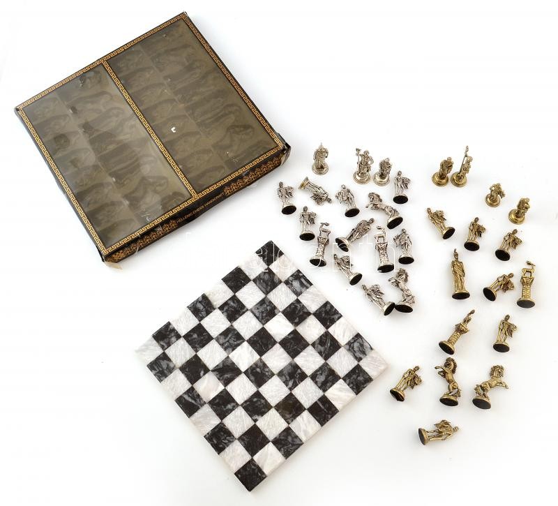 Leírás: Görög kiadású, görög mitológiai figurákat ábrázoló fém sakk készlet, márvány táblával eredeti dobozában Tábla 27x27 cm
