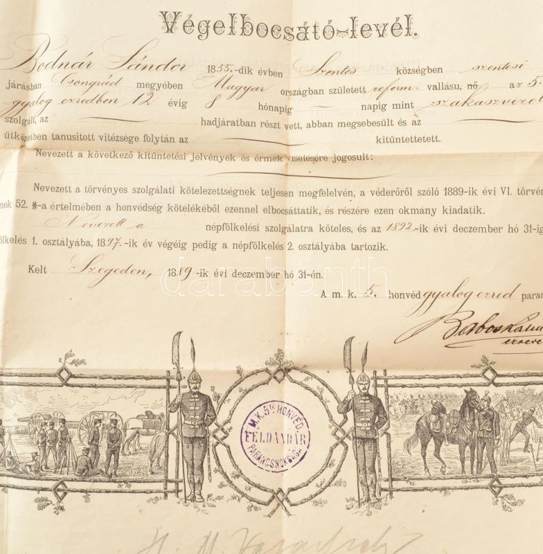1889 Végelbocsájtó levél szakaszvezető részére, 40×54 cm https://www.darabanth.com/hu/426-Gyorsarveres/426.0/Mutargy-papirregiseg-egyeb/Militaria~500031/1889-Vegelbocsajto-level-szakaszvezeto-reszere-40C39754-cm~II2723823