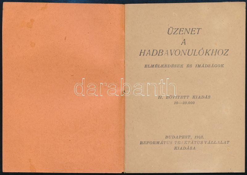 Leírás: 1942 Bp., Üzenet a hadba vonulókhoz, elmélkedések és imádságok, 31p