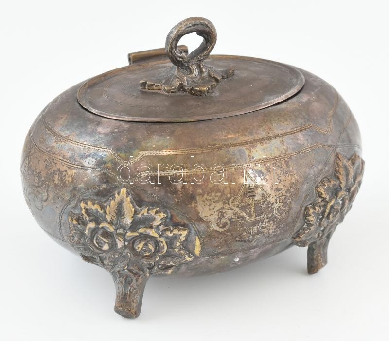 Leírás: Alpakka, ezüstözött cukordoboz, olvashatatlan jelzéssel, kopott, m: 12 cm