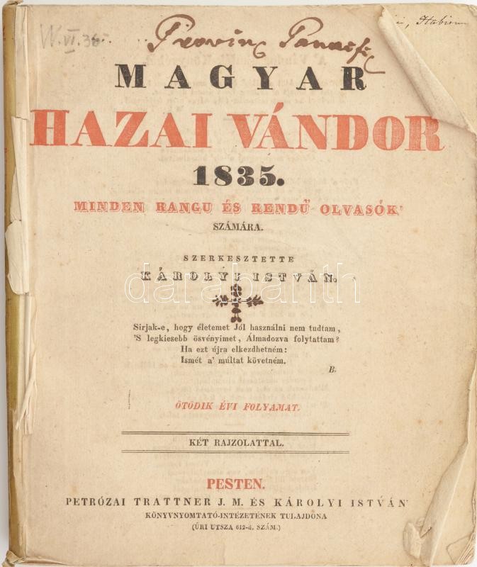 1835 Magyar hazai vándor 1835. Minden rangu és rendű olvasók számára. Szerk.: Károlyi István. Ötödik évi folyamat. Pest, 1835, Petrózai Trattner J. M. és Károlyi István, 8 sztl. lev.+172 p. Borító nélküli példány, a 2 tábla hiányzik, bejegyzésekkel, szamárfüles címlappal,kissé foltos lapokkal, tulajdonosi névbejegyzéssel és bejegyzésekkel.