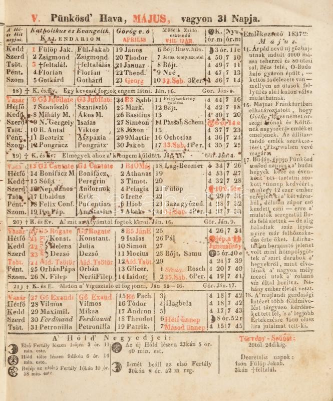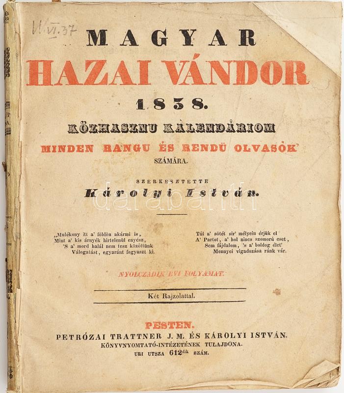 1838 Magyar hazai vándor 1838. Közhasznu kalendáriom minden rangu és rendü olvasók számára. Szerkesztette: Károlyi István. Nyolczadik évi folyamat. Pest, 1838., Petrózai Trattner J. M. és Károlyi István,6 sztl. lev.+167+1 p. Borító nélküli példány, javított címlappal, a 2 tábla hiányzik, bejegyzésekkel.