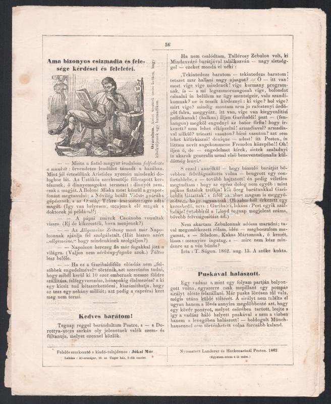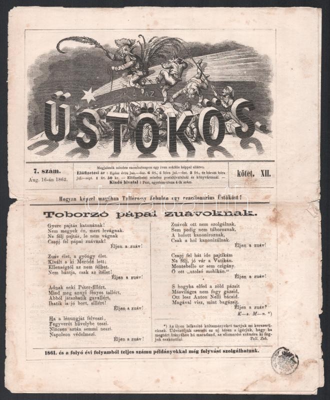 1862 Az Üstökös, XII. köt. 7. sz., 1862. aug. 16., szerk. és kiadó-tulajdonos: Jókai Mór. Pest, Landerer és Heckenast-ny., 8 p. Szakadásokkal, szétvált, foltos.