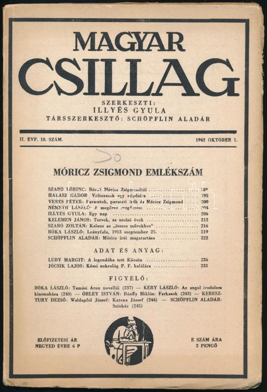 1942 Magyar Csillag Móricz Zsigmond emlékszám II. évf. 10. szám. https://www.darabanth.com/hu/426-Gyorsarveres/426.0/Mutargy-papirregiseg-egyeb/Nyomtatvanyok~1000004/1942-Magyar-Csillag-Moricz-Zsigmond-emlekszam-II-evf-10-szam~II2714010