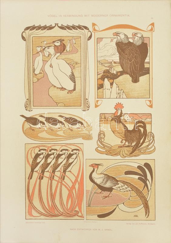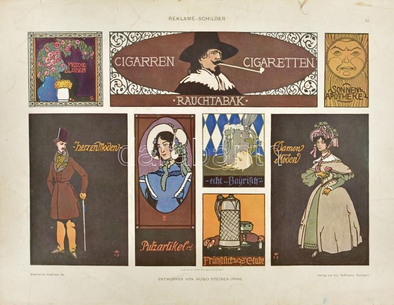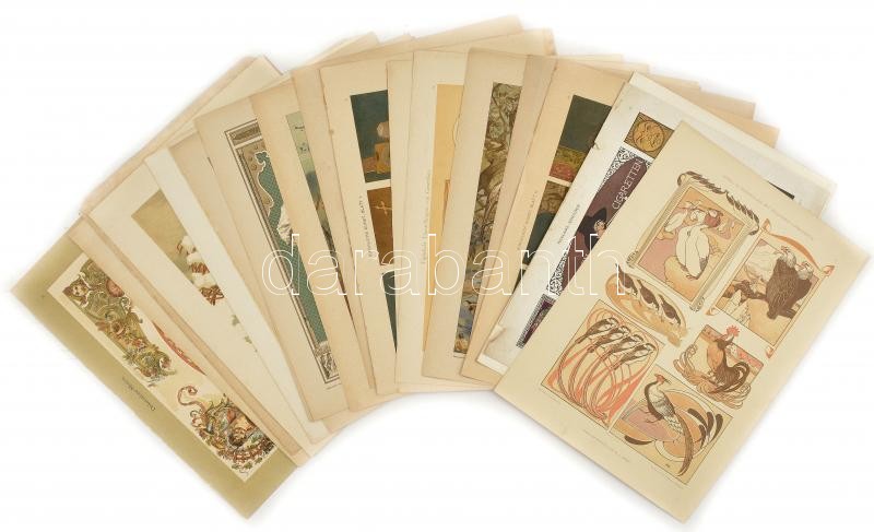 cca 1895-1910 Dekorative Vorbilder, össz. 25 db szecessziós (részben japonizáló), historizáló és egyéb ornamentikával, illusztrációval díszített nyomat. Több Georg Sturm (1855-1923) műve, egy másikon Hugo Steiner-Prag (1880-1945) szecessziós reklám tábla terveivel. Helyenként lap széle kissé sérült. Lapméret: 36x25 cm (egy db 32,5x25 cm).
