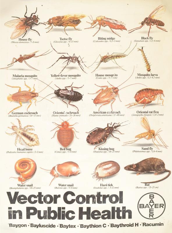 cca 1980 Vector Control in Public Health, Bayer rovarokat, kártevőket ismertető, nagyméretű egészségvédelmi plakátja, műanyag, kopásnyomokkal, 90x65 cm
