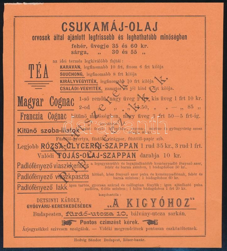 Leírás: Detsinyi Károly Gyógyáru Kereskedése (gyógszertár) a "Kígyóhoz" reklámlap