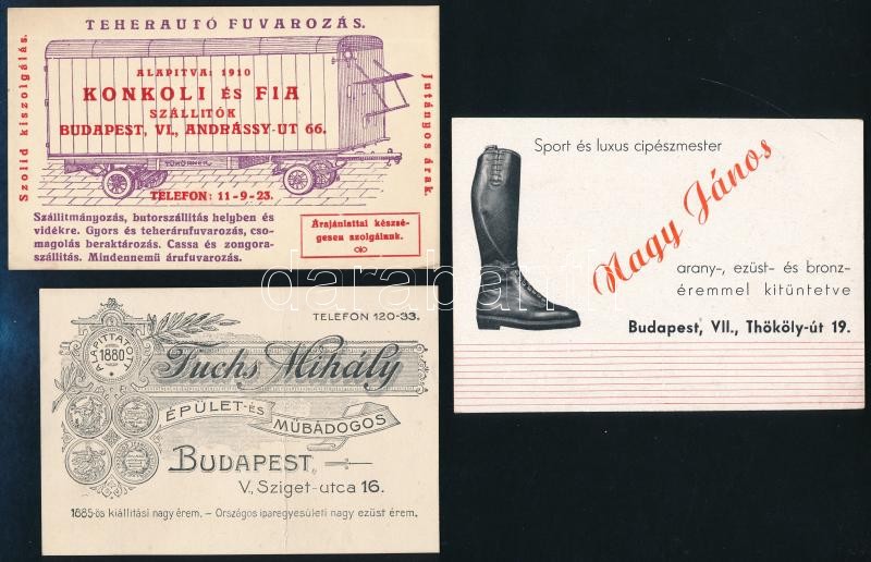 cca 1890-1910 Vegyes reklám tétel, 3 db: Fuchs Mihály épület- és műbádogos, Nagy János sport és luxus cipészmester, Konkoli és Fia szállÃtók reklámkártyái, 9x14 cm és 10x14 cm közötti méretben