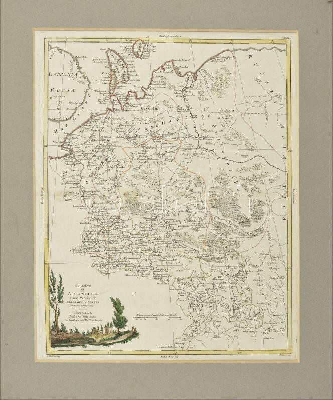 Oroszország rézmetszetű térképe. Governo di Arcangelo, e sue provincie nella Russia Europea di nuova proiezione. Zatta Antonio.Venezia, 1782. Színezett rézmetszet paszpartuban / Copper plate engaving 33x42 cm
