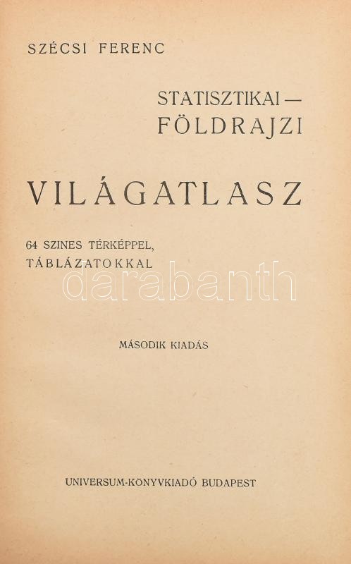 cca 1940 Szécsi Ferenc: Statisztikai-földrajzi világatlasz. Bp., é.n., Universum ("Élet"-ny.), 1 t.+78+(1) p.+59 t.+63+(1) p. Színes térképekkel, köztük több kétoldalas. Kiadói egészvászon-kötés, kissé foltos borítóval.