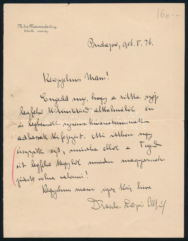 1916 thordai Drasche-Lázár Alfréd (1875-1949) a M. Kir. Miniszterelnökség Elnöki Osztálya vezetőjének saját kézzel írt gratuláló levele, fejléces papíron, aláírásával, szakadt.