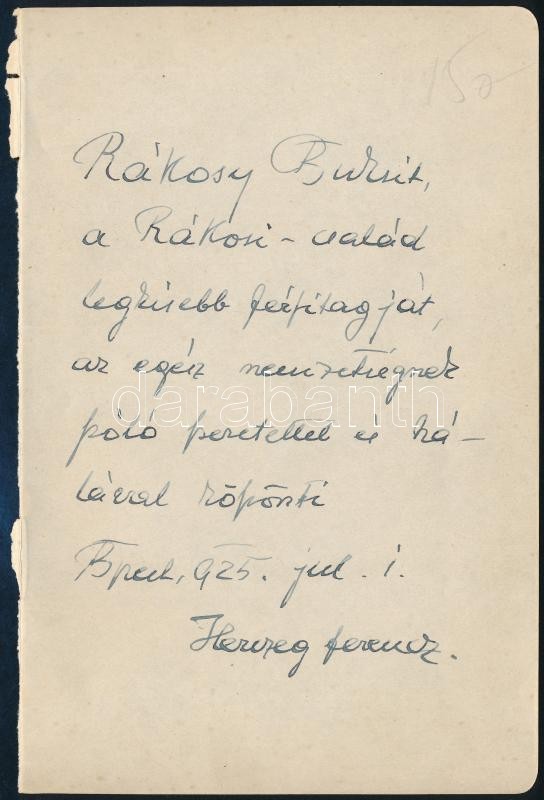 1925 Herczeg Ferenc (1863-1954) író, szerkesztő üdvözlő sorai Rákosi B... https://www.darabanth.com/hu/426-Gyorsarveres/426.0/Mutargy-papirregiseg-egyeb/Tortenelmi-dokumentumok-keziratok-erdekessegek~500021/1925-Herczeg-Ferenc-1863-1954-iro-szerkeszto-udvozlo-sorai-Rakosi-Buksi-Rakosi-Jeno-18~II2719312