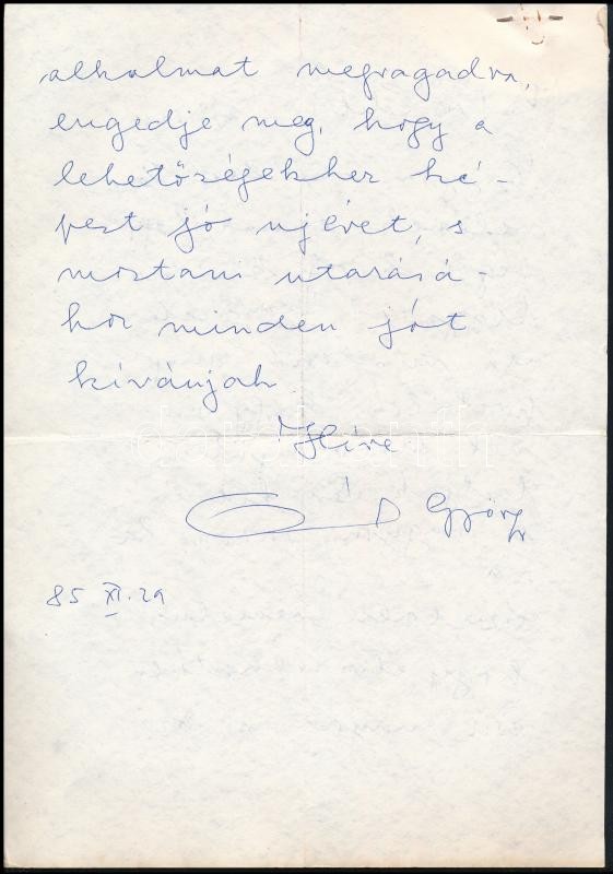 1985 Aczél György (1917-1991) kommunista politikus saját kézzel írt, személyes hangú levele Vas Zoltán (1903-1983) író, 56-os államminiszter felesége részére