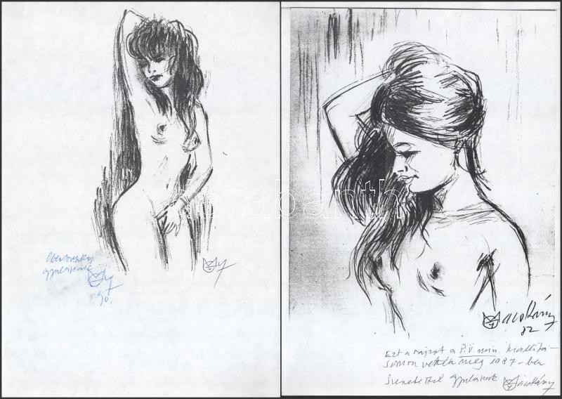 1990 Macskássy János (1910-1993) grafikus autográf levele Obersovszky Gyula (1927-2001) költő, író, újságíró, 1956-os forradalmár. a Sportfogadás szerkesztőjének, amelyben felajánlja közlésre rajzait. 3 beírt oldal, Macskássy János autográf aláírásával. Mellékelve 5 lap, Macskássy János erotikus, női aktokat ábrázoló rajzairól készült fénymásolat, mind Obersovszky Gyulának dedikálva. 30x21 cm
