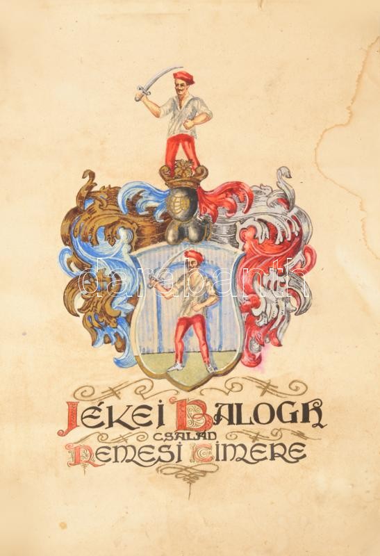 A jékei Balogh család nemesi címere. Vegyes technika, papír, feltekerv... https://www.darabanth.com/hu/426-Gyorsarveres/426.0/Mutargy-papirregiseg-egyeb/Tortenelmi-dokumentumok-keziratok-erdekessegek~500021/A-jekei-Balogh-csalad-nemesi-cimere-Vegyes-technika-papir-feltekerve-kis-lapszeli-szakadas~II2717922