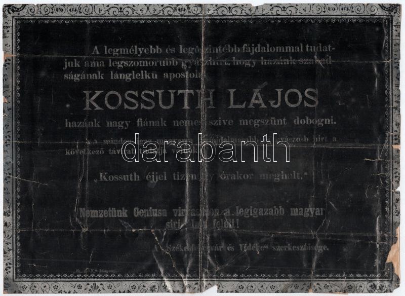 Leírás: cca 1894 Kossuth Lajos (1802-1894) halálozási értesítője, egykorú másolat/sokszorosítás, sérült, javított