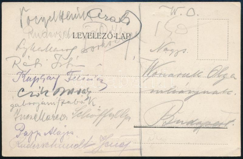 cca 1930 Csók István (1865-1961) festőművész, Réti István (1872-1945), a Képzőművészeti Főiskola későbbi rektora, Lyka Károly (1869- 1965) művészettörténész, kritikus, Kupcsay Felicián (1876-1964) miniszteri tanácsos, író, Gáborjáni Szabó Kálmán (1897-1955) festőművész és más azonosítatlan személyek aláírásai képeslapon, ismeretlen személy részére.
