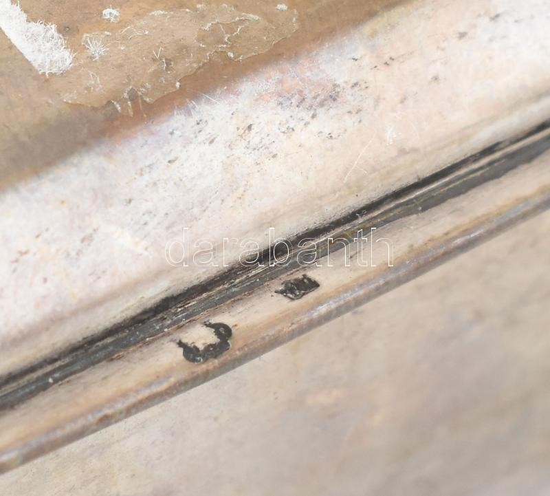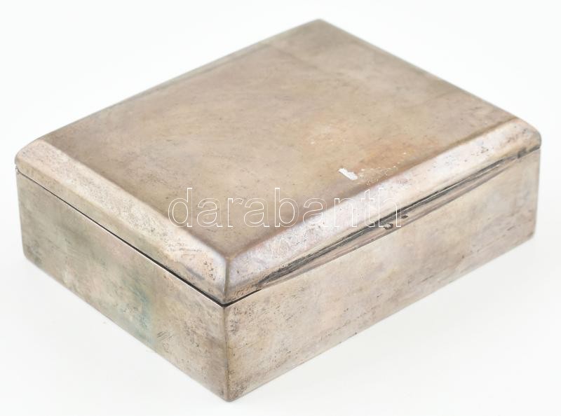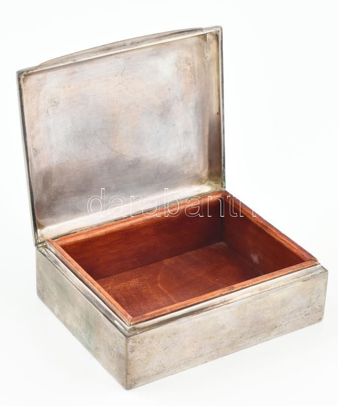 Leírás: Ezüst (Ag) dobozka, fabetéttel, jelzett, kopott, nettó: 141g, 10x8 cm