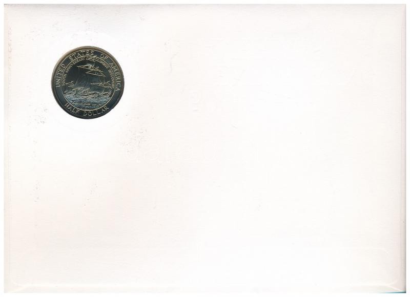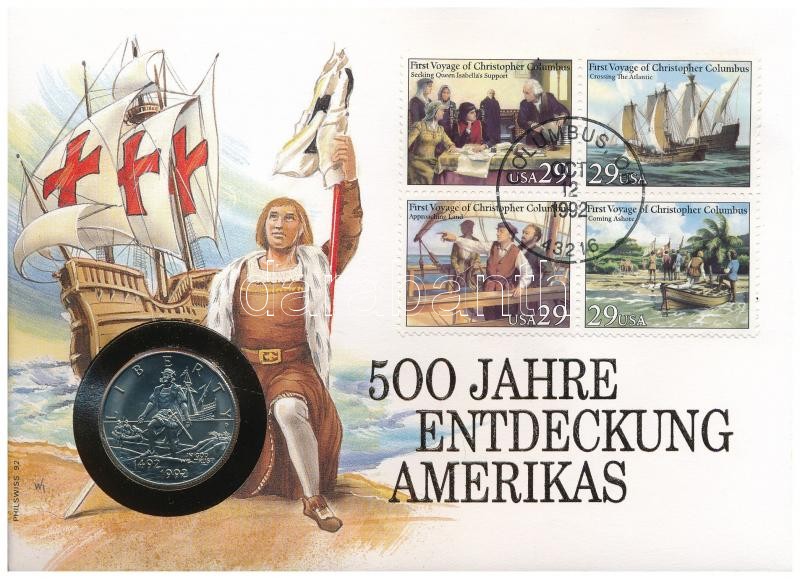 Amerikai Egyesült Államok 1992D 1/2$ Cu-Ni "Kolombusz Kristóf utazásának 500. évfordulója" forgalomba nem került emlékkiadás felbélyegzett borítékban, bélyegzéssel, német nyelvű leírással T:1 USA 1992D 50 Cents Cu-Ni "The 500th Anniversary of Columbus's Voyage" non-circulating commemorative coin in envelope with stamp, cancellation, and a description in german C:UNC Krause KM#237