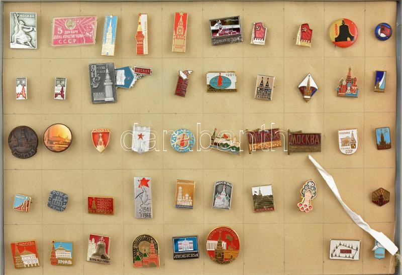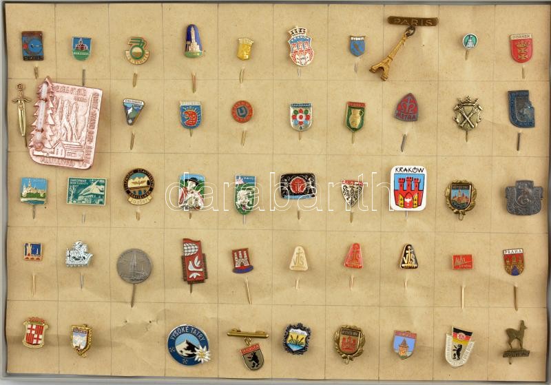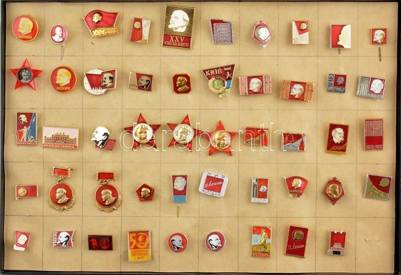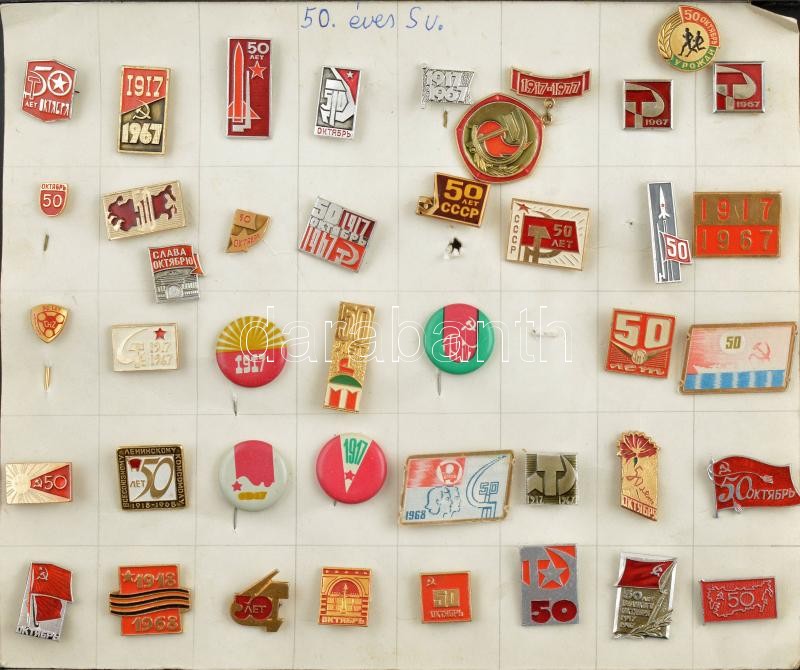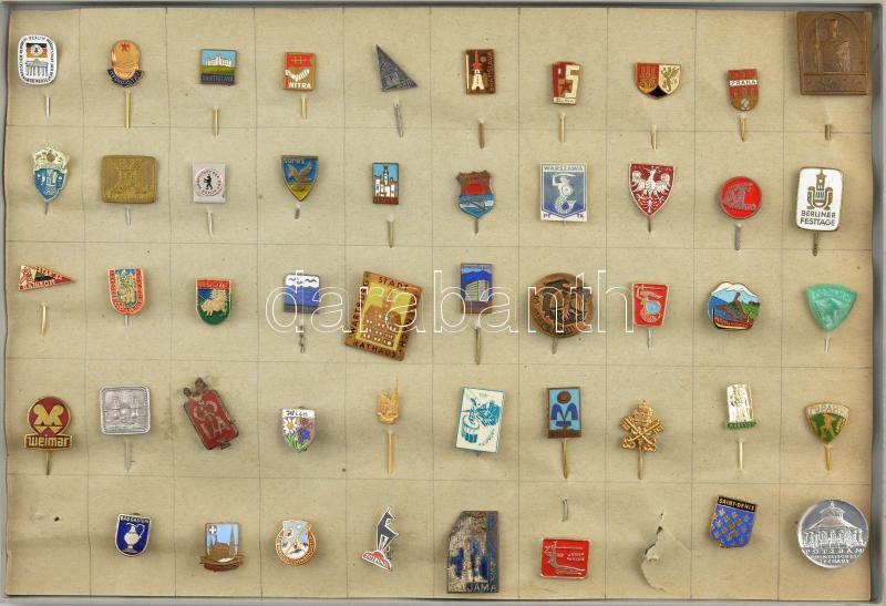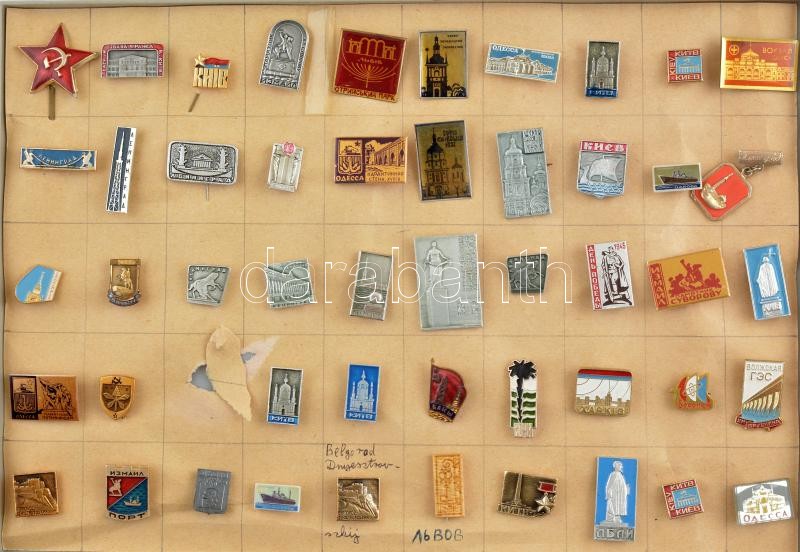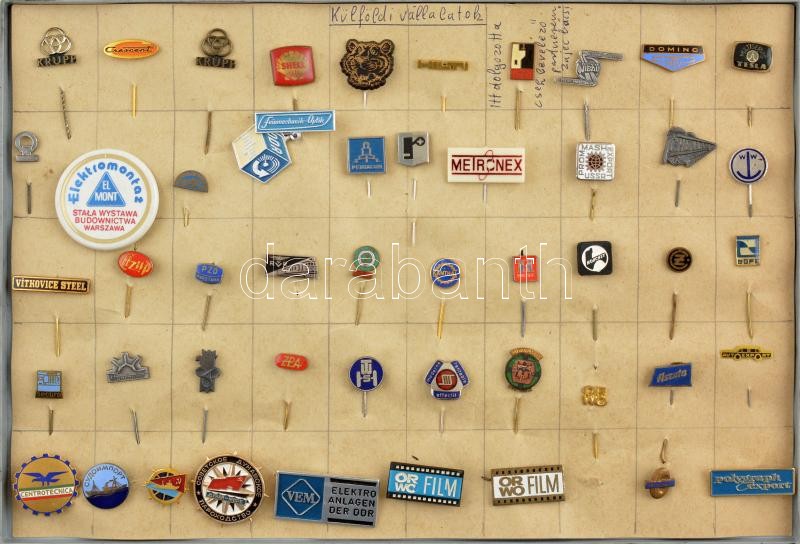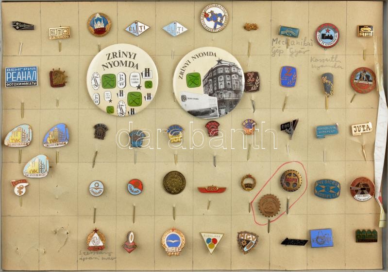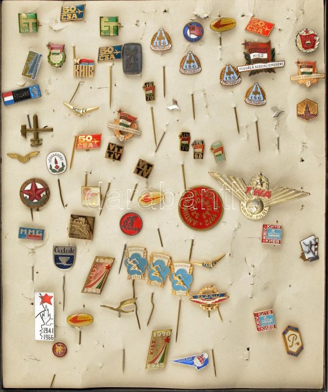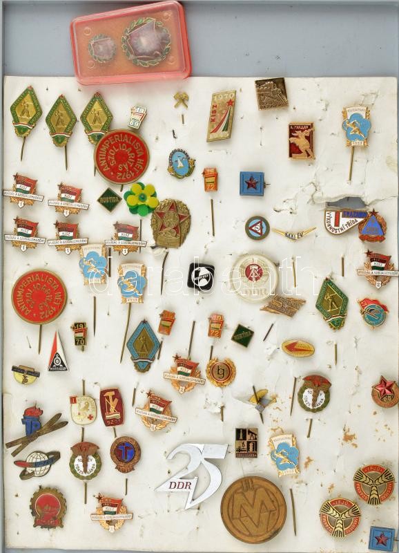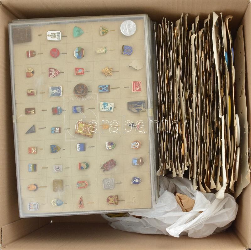 Több mint 1800 darabos jelvény és kitűző tétel hagyatékból, legnagyobbrészt különböző darabok. Vegyesen magyar és külföldi anyag, a magyar rész elsősorban a szocialista időszakból így nagyobb számban tartalmaz jó minőségű zománcozott törzsgárda jelvényeket is. Témakörönként szétválogatva műanyag tálcákra illetve kartonlapokra rendezve, valamint egy kisebb zacskóban több egyforma jelvény nagyobb darabszámban. Érdekes, átnézésre érdemes, adott esetben tovább értékesíthető anyag!