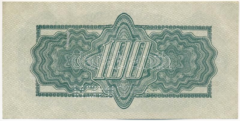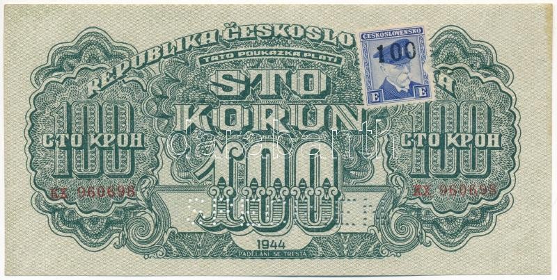 Csehszlovákia 1944. 100K "SPECIMEN" perforációval és Masarykot ábrázoló "E" jelzésű bélyeggel, rajta fekete "100" felülbélyegzéssel "KX 960698" T:II,II-